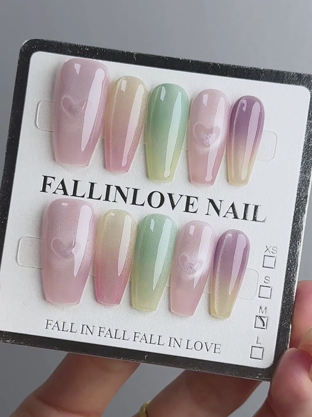 Colorful Shimmer & Dreamy Heart Cat-Eye Coffin Handmade Press-On Nails NF046